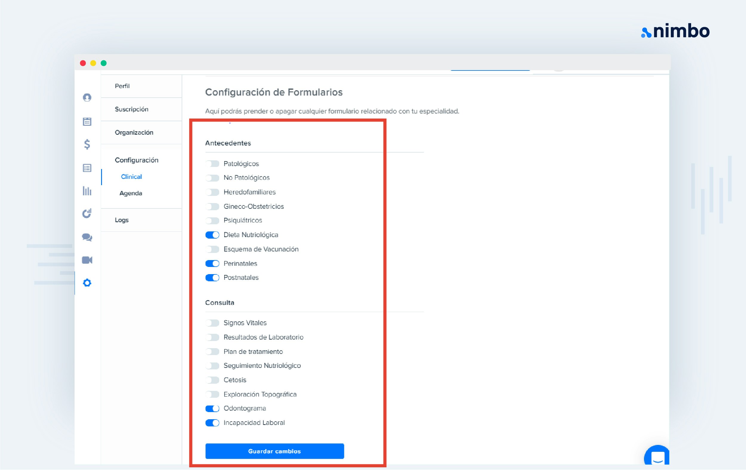 El Seguimiento Nutriológico es uno de los módulos que Nimbo ha desarrollado para aquellos médicos que requieran dar un seguimiento constante hacia sus pacientes.Ve a Mi cuenta > Configuración > ClinicalCuando te encuentres en el apartado de Clinical, busca la sección de ‘Configuración de formularios’ y activa la función ‘Seguimiento Nutriológico’.
