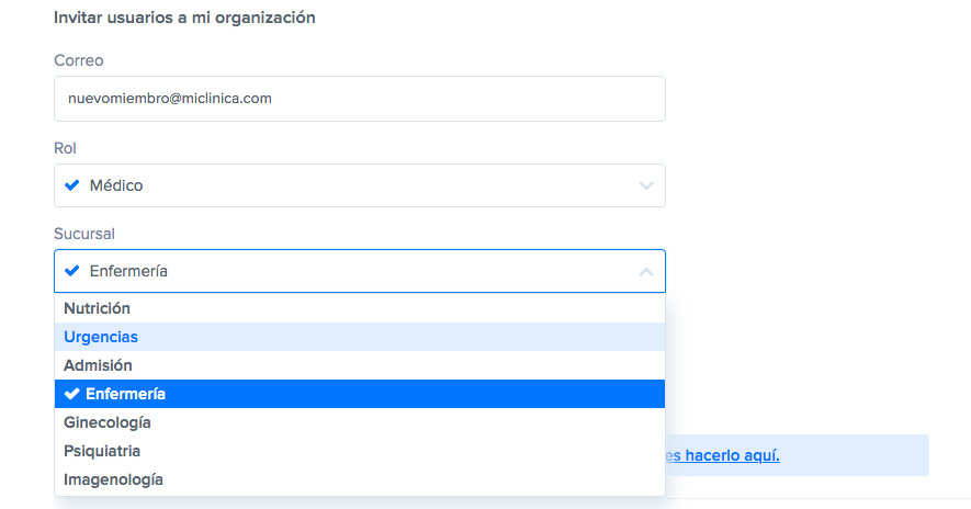 Si vas a agregar nuevos miembros a tu organización y deseas asignarlo a un departamento o área de tu clínica podrás realizarlo al momento de darlo de alta: